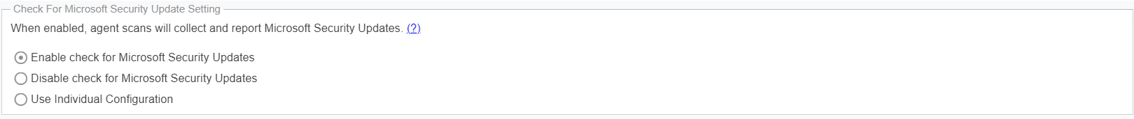 The Check for Missing Microsoft Security Update Settings determines whether or not agents perform the Windows Update check to collect and report missing Microsoft Security Updates: