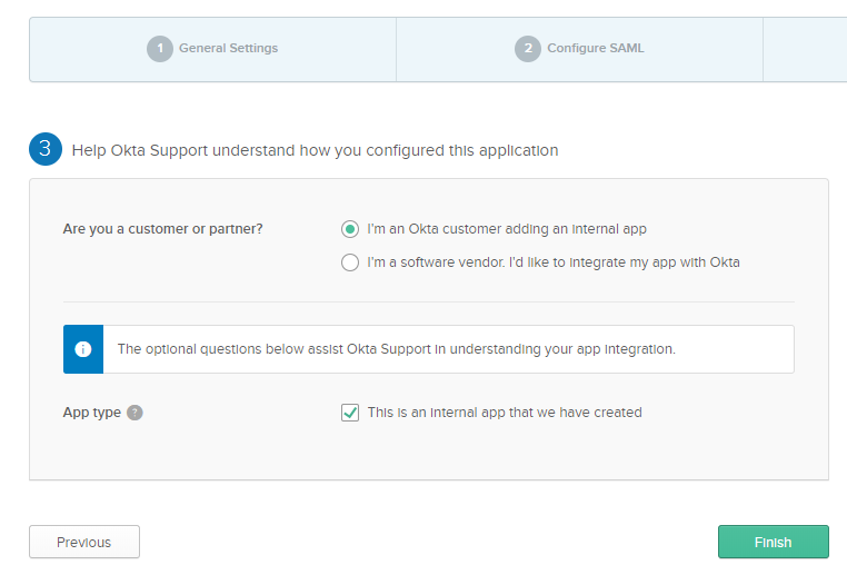 Click (if not already selected) I’m an Okta customer adding an internal app for the Create SAML Integration - Step 3 Feedback screen.