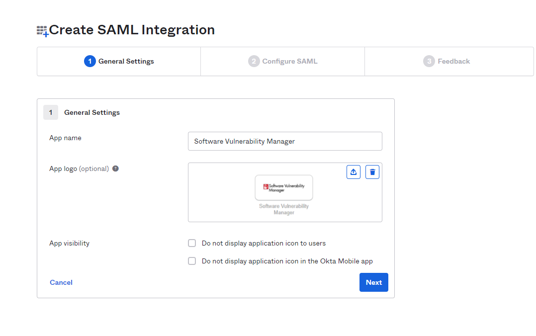 To set up Okta (SAML 2.0) to use as a single sign-on (SSO) with Software Vulnerability Manager: