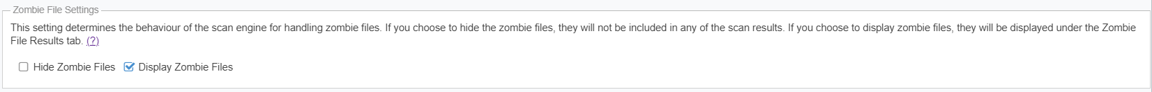 The Display Zombie Files check box option enables only when the Hide Zombie Files option is unchecked. With the Display Zombie Files check box enable, the discovered zombie files will be displayed in the Scanning > Completed Scans > View Scan Result > Zombie File Results tab. For more information, see Zombie File Results.