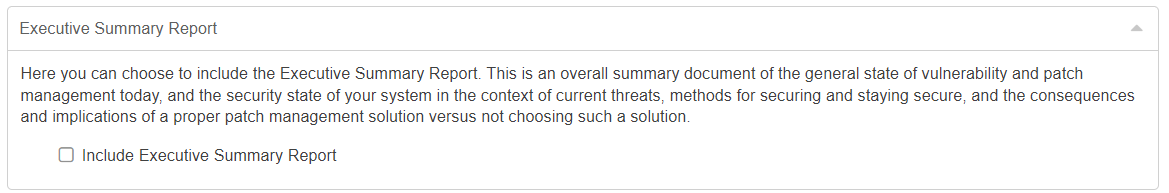 In the Execute Summary Report, select the Include Executive Summary Report check box which provides an overall summary with the general state of vulnerability and patch management.